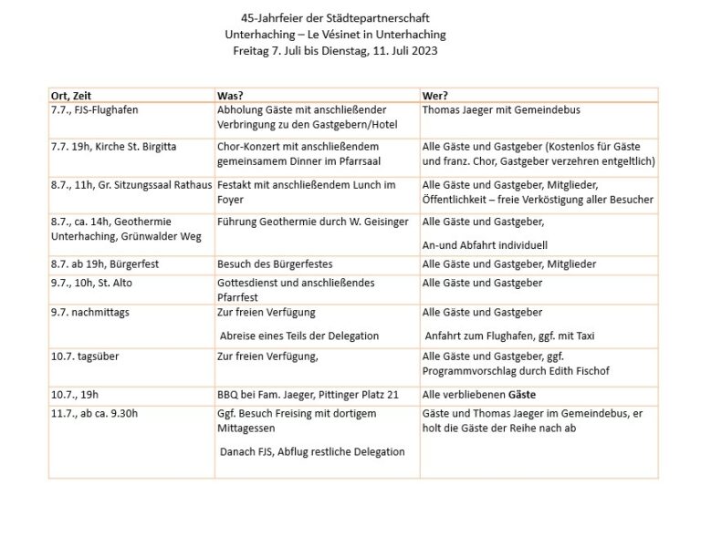 Du 7 au 11 Juillet 2023, une délégation de vésigondins s’est rendue à Unterhaching à l’occasion de la traditionnelle Burgerfest, au cours de laquelle a été célébré le 45ème anniversaire du jumelage entre nos deux villes.